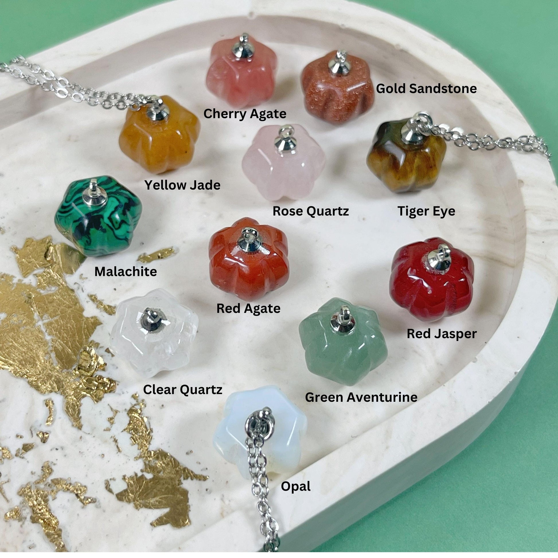You have the pick of the pumpkin patch with our earrings, as they come in a range of gemstones from Red Agate, Rose Quartz, Green Aventurine, Malachite, Gold Sandstone, Clear Quartz, Tiger Eye, Red Jasper, Cherry Agate, Opal or Yellow Jade.
