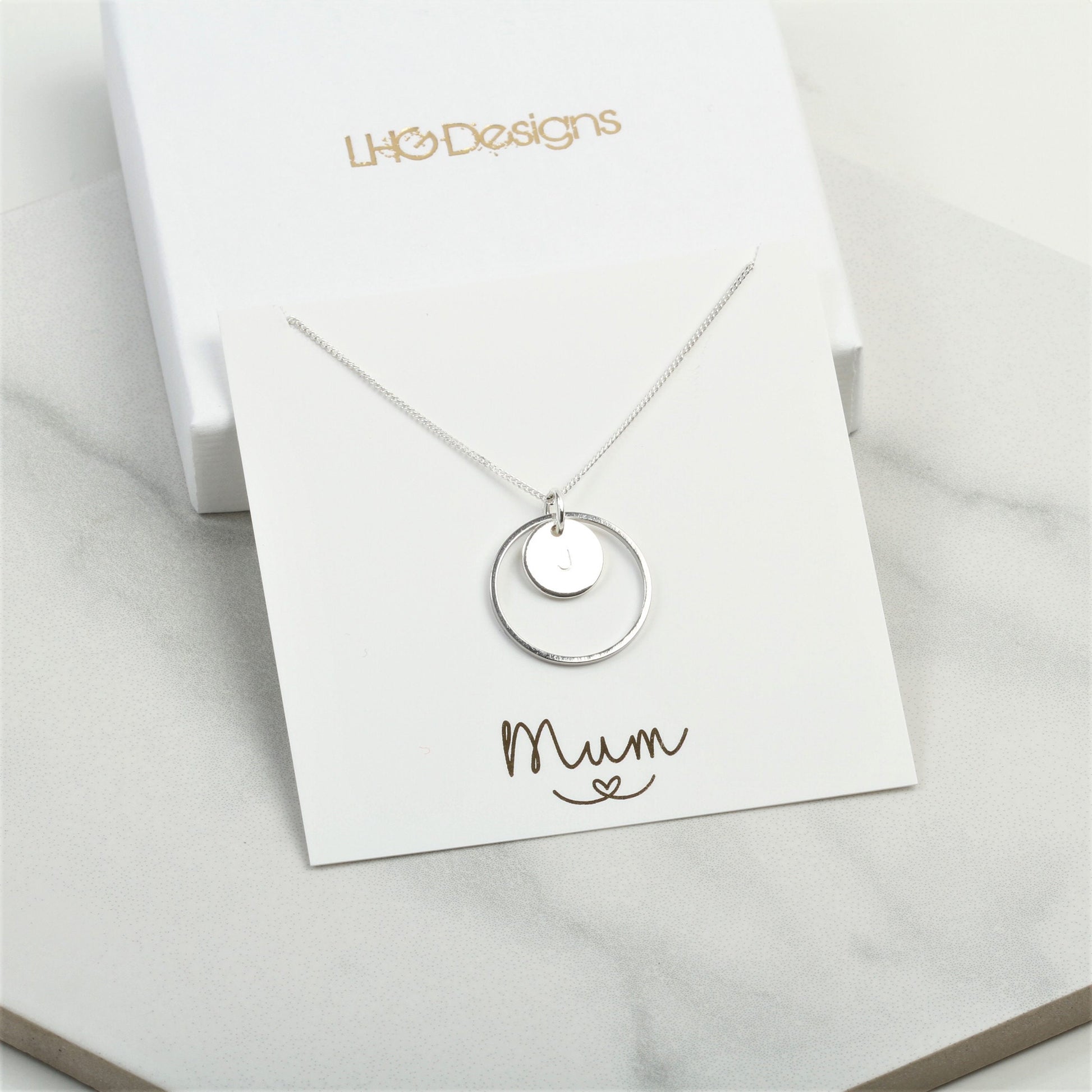 Beautifully simplistic circle pendant design with small disc which is personalised with an initial of your choice.